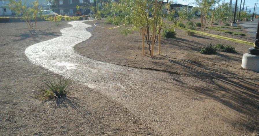 Project Objectives The primary objective was to create a clean, non-tracking surface for safe pedestrian and bike access through a newly installed decomposed granite landscape. The area separated a parking lot from the adjacent street and sidewalk, but loose granite was constantly being tracked onto paved surfaces—creating unsightly messes, maintenance headaches, and a safety hazard for cyclists on the nearby sidewalk.